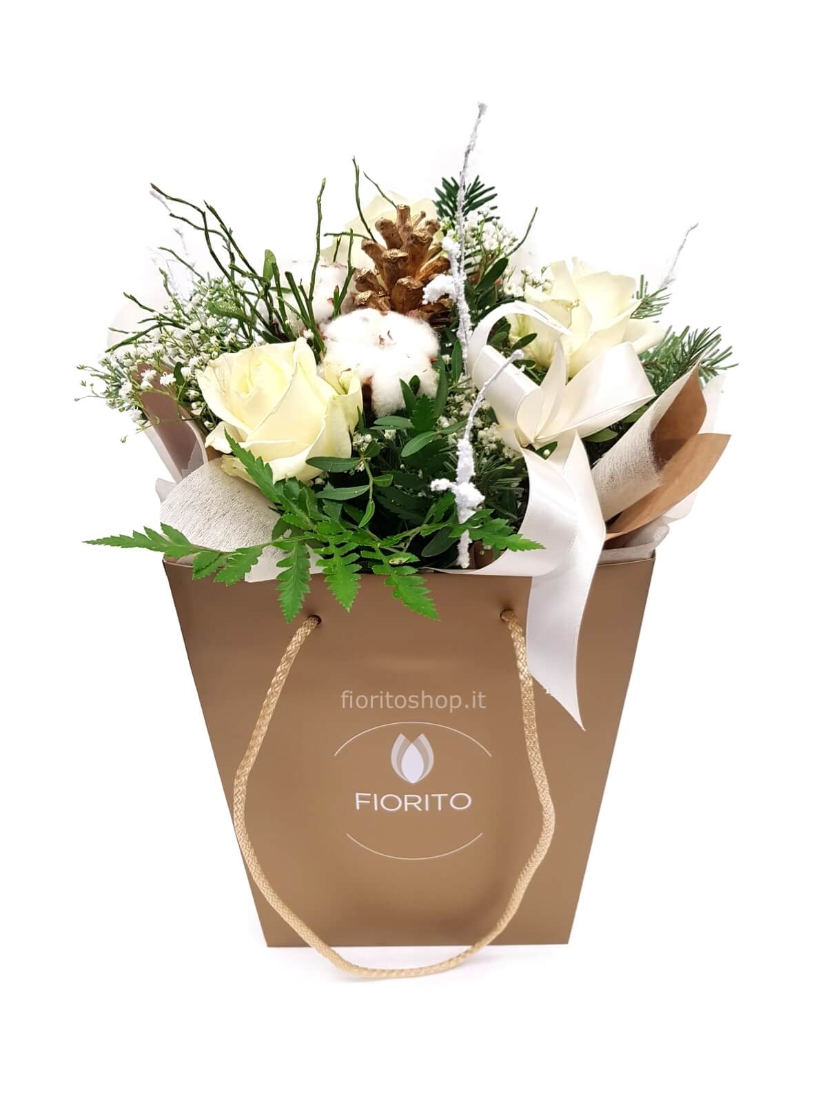 Il bouquet viene poi venduto confezionato nello shopper dorato grande (23X18X25 cm).