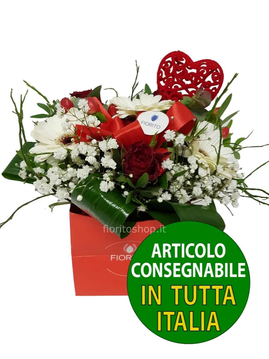 Composizione di rose e gerbere a colori bianchi e rossi in spugna all'interno di un cubotto di cartone rosso impermeabilizzato di cm 13x13x13 e arricchito con una pick a tema d'amore. Il tutto viene poi confezionato in uno shopper coordinato nel colore del cubotto.