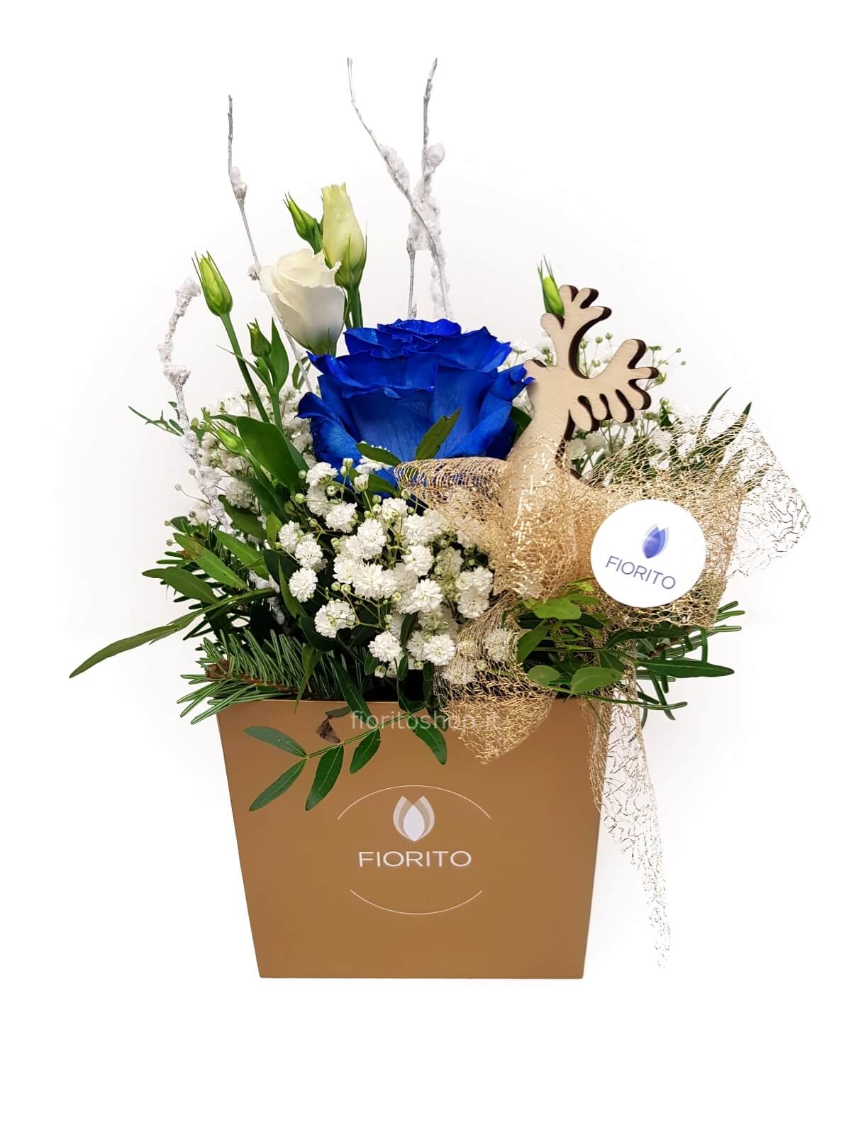 Composizione di fiori in spugna con una rosa blu all'interno di un cubotto di cartone dorato impermeabilizzato di cm 13x13x13, arricchita con fiori rossi e pick decorativa tematica. Il tutto viene poi confezionato in uno shopper coordinato nel colore del cubotto.