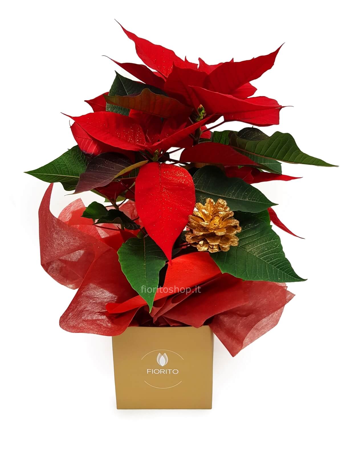 Stella di Natale altezza 50 cm circa confezionata con decori natalizi, inserita in un cubotto di cartone dorato impermeabilizzato di cm 13x13x13 e infine confezionata in uno shopper coordinato col colore del cubotto.